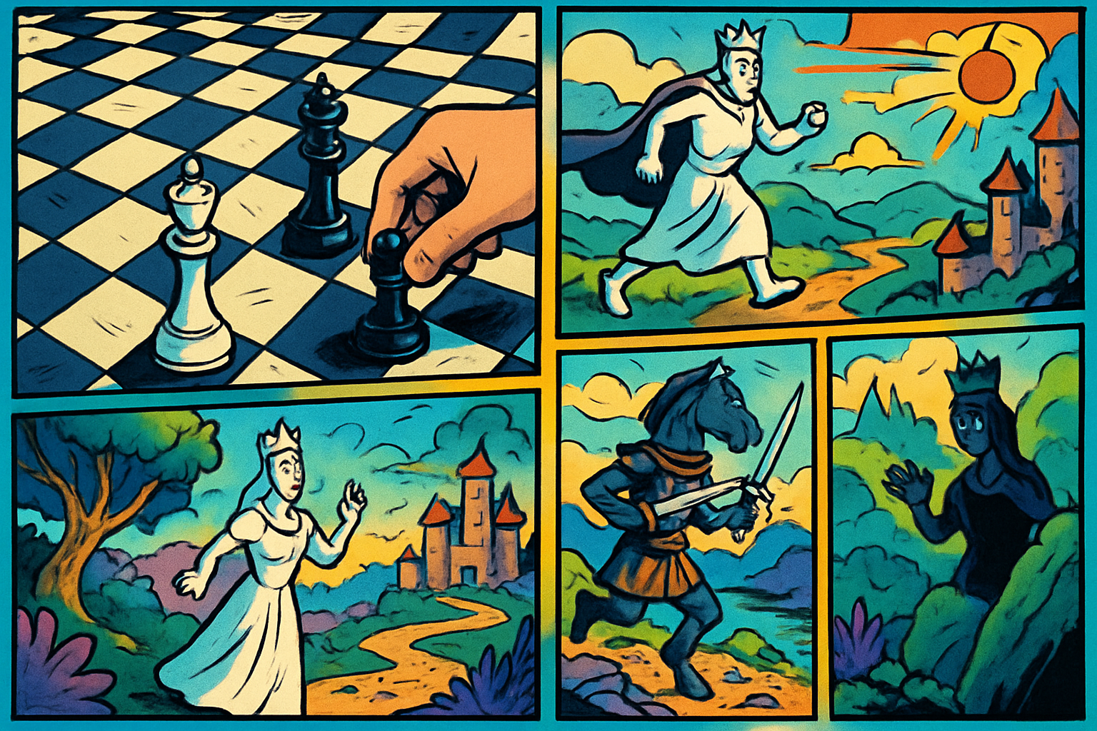 Turn chess moves into a playable comic-game. Design a short game where each move becomes a panel and player choices rewrite the board and story.