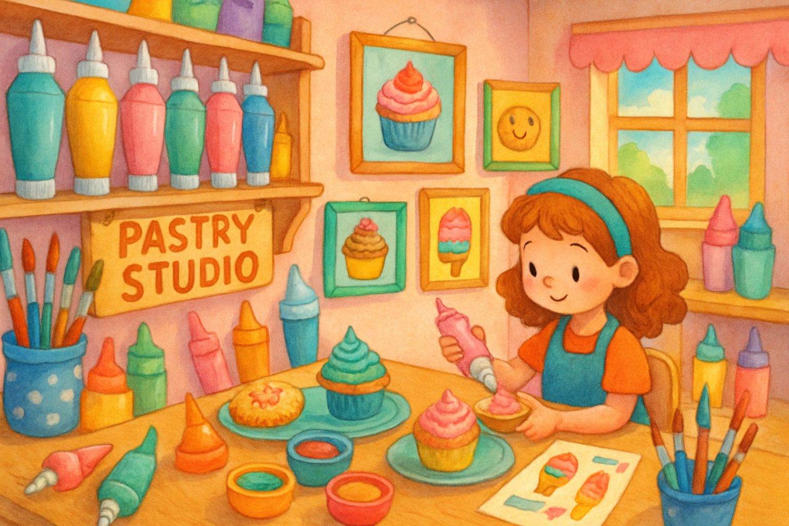 Paint with frosting and food color to build a mini pastry studio. Mix color, texture, and shape to create edible art and a tasty gallery to share.