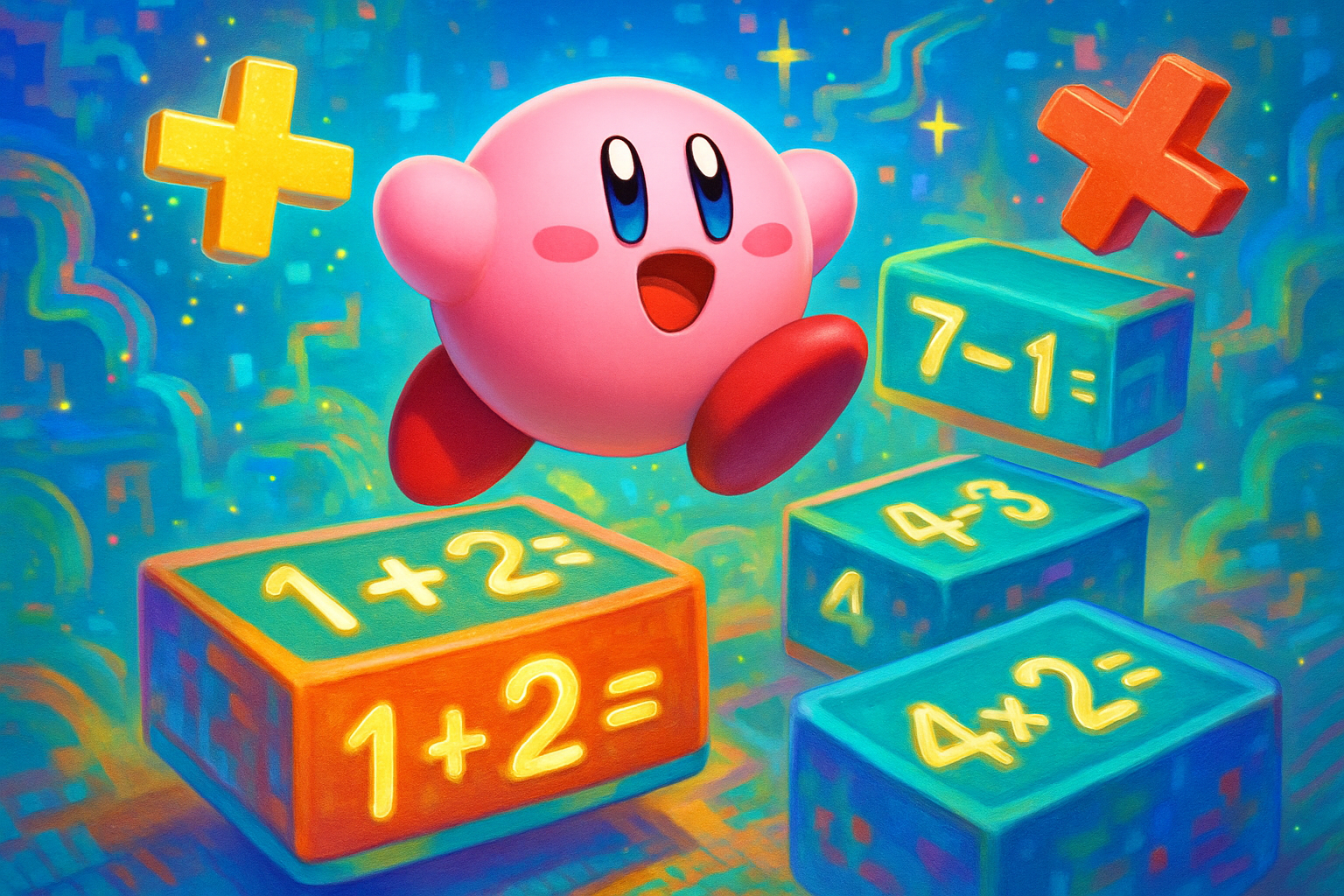 Join Kirby in a digital math quest where you'll conquer two-digit addition, subtraction, and one-digit multiplication puzzles while bringing your creative comic to life with digital art!