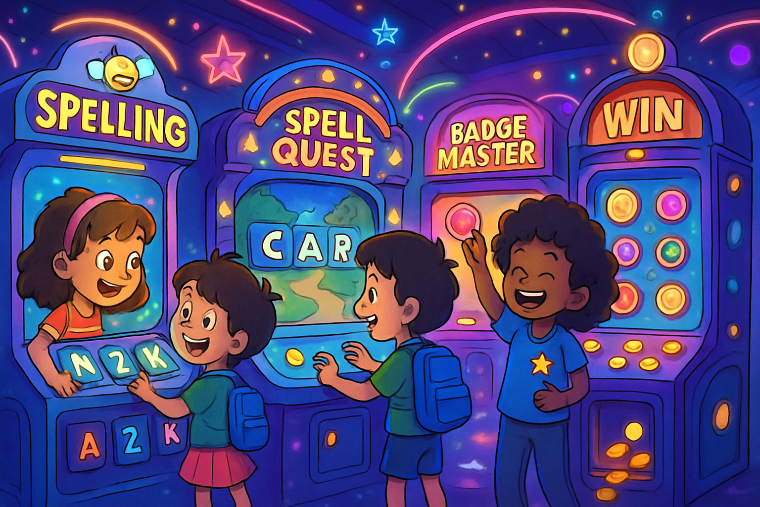 Turn spelling into an arcade adventure: invent magical mini-games, earn letter-tokens, and celebrate every reading win with badges and a leaderboard.