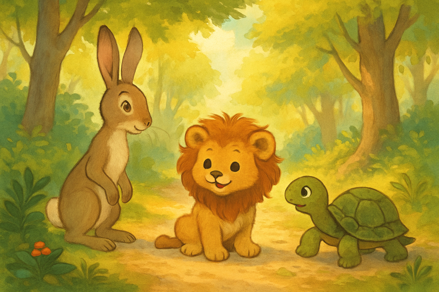 Design your own magical character for The Hare and the Tortoise story, with a playful example of a puppy lion to spark your creativity.